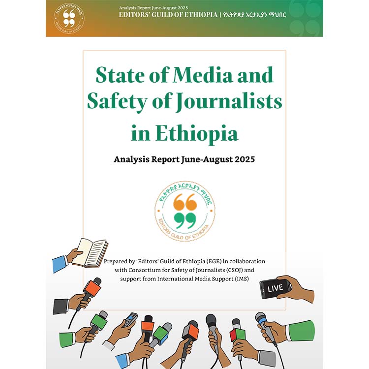 Resources Home » Resources State of Media and Safety of Journalists in Ethiopia Analysis Report June-August 2025 State of Media and Safety of Journalists in Ethiopia Analysis Report March – May 2025 Applying UNESCO’s Journalists’ Safety Indicators (JSIs) Assessment of Media Development in Ethiopia Complation of Briefing Papers on The Media Sector Development in Ethiopia Building Digital Safety For Journalism Gender in Ethiopia Media Landscape Journalists Safety Guide Handbook Journalists’ Safety Indicators: International Level Journalists’ Safety Indicators: National Level UN Plan of Action on The Safety of Journalism UNESCO’s Media Indicators